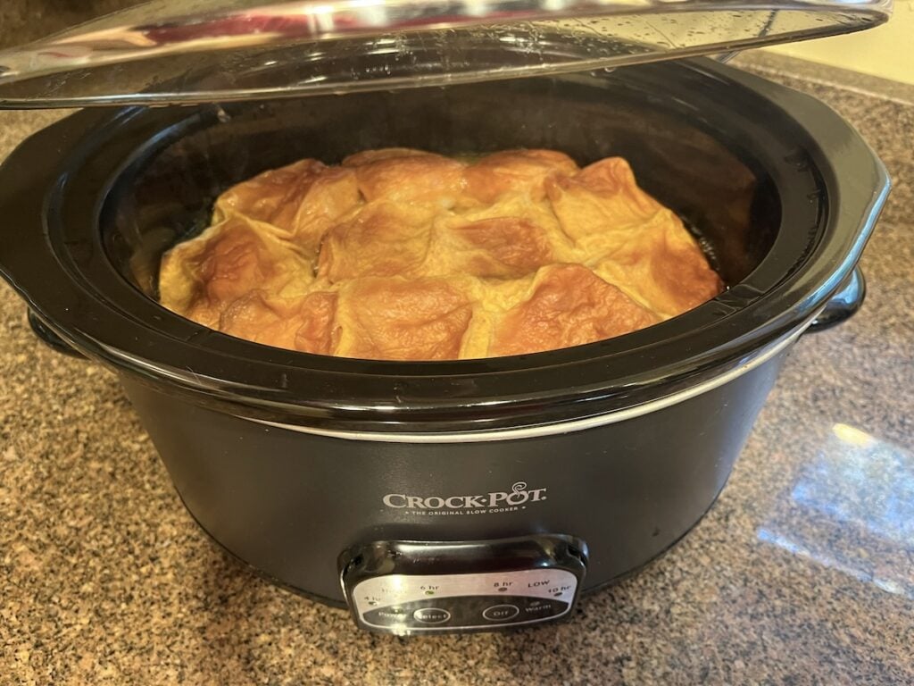 I made this recipe using the 6-quart programmable Crock Pot that I’ve had for years. Yours may be bigger or small and will affect how many pieces of Hawaiian rolls you can fit in a single layer when making this casserole. I was able to fit 10 rolls.