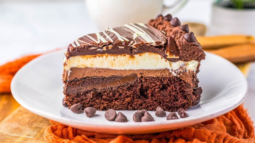 Chocolate cake, cheesecake, mousse, and ganache layer before chilling until firm. The stacked structure sets into defined sections that slice cleanly once cold. Preparing it in advance steadies dessert timing and removes last-minute pressure. Serving each slice makes staying in feel like the plan all along.