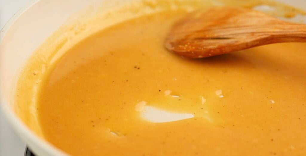 With this method, you should continue cooking and whisking the mixture until it reaches the desired golden color. Keeping it moving in the pan prevents scorching. Once cooked, use it immediately.