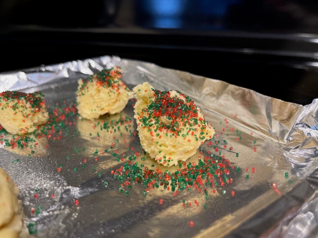 After scooping, I place the dough on a baking sheet covered in aluminum foil, which I covered in cooking spray so the cookies would not stick. Normally I would use parchment paper but we were out. Then, I sprinkled the red and green sugar all over the dough balls. Alternately, you could put the red and green sugar on a plate and roll the dough through it.
