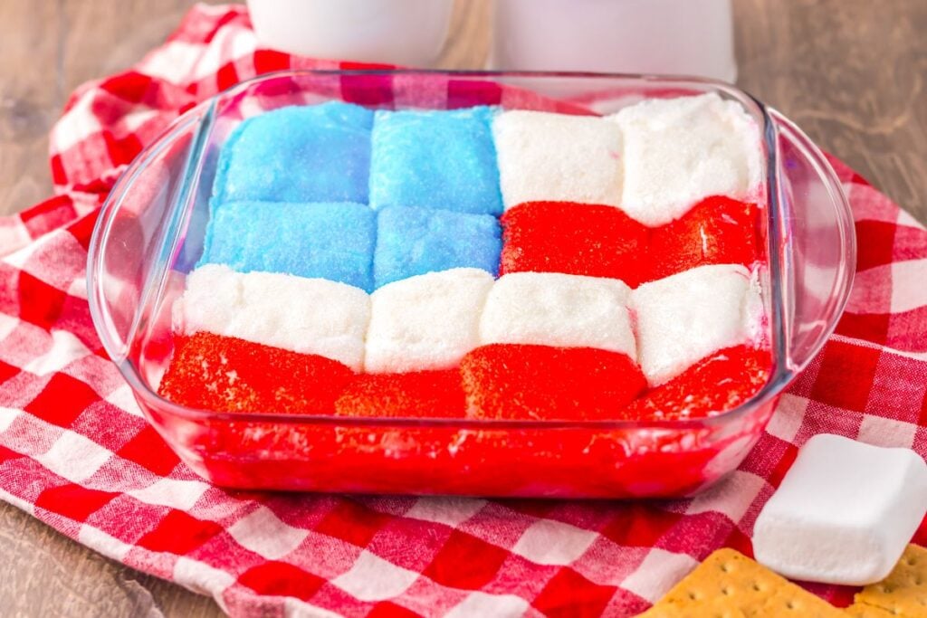 This red, white and blue 4th of July s’mores dip recipe is designed to look like an American flag and used on a patriotic holiday. However, it is a kid-friendly dessert that you can bring out all year round when you want a fun, hands-on sweet.